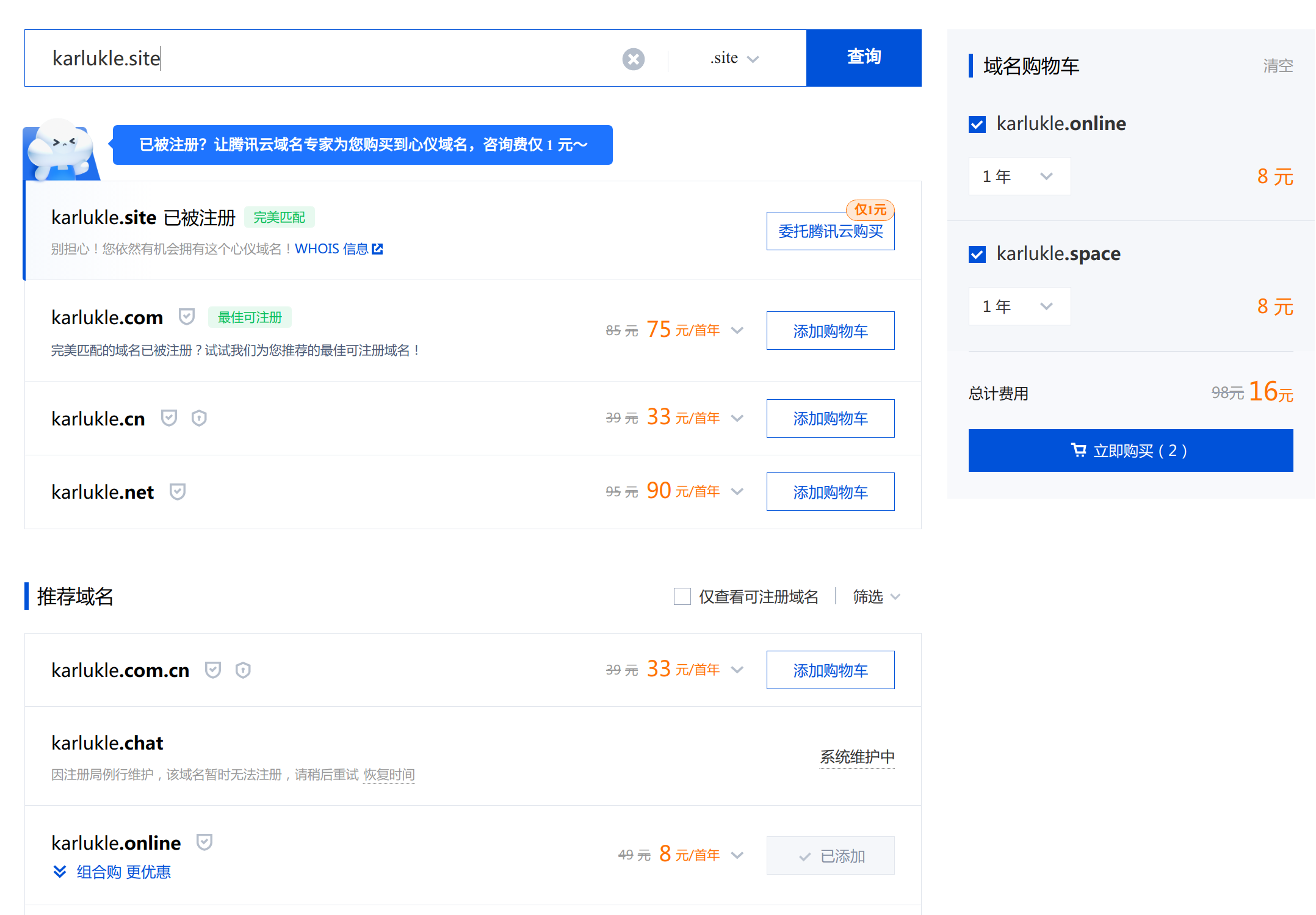 随便找一个国内的服务商,按照流程购买域名,需要实名认证。本域名是在腾讯云注册的。