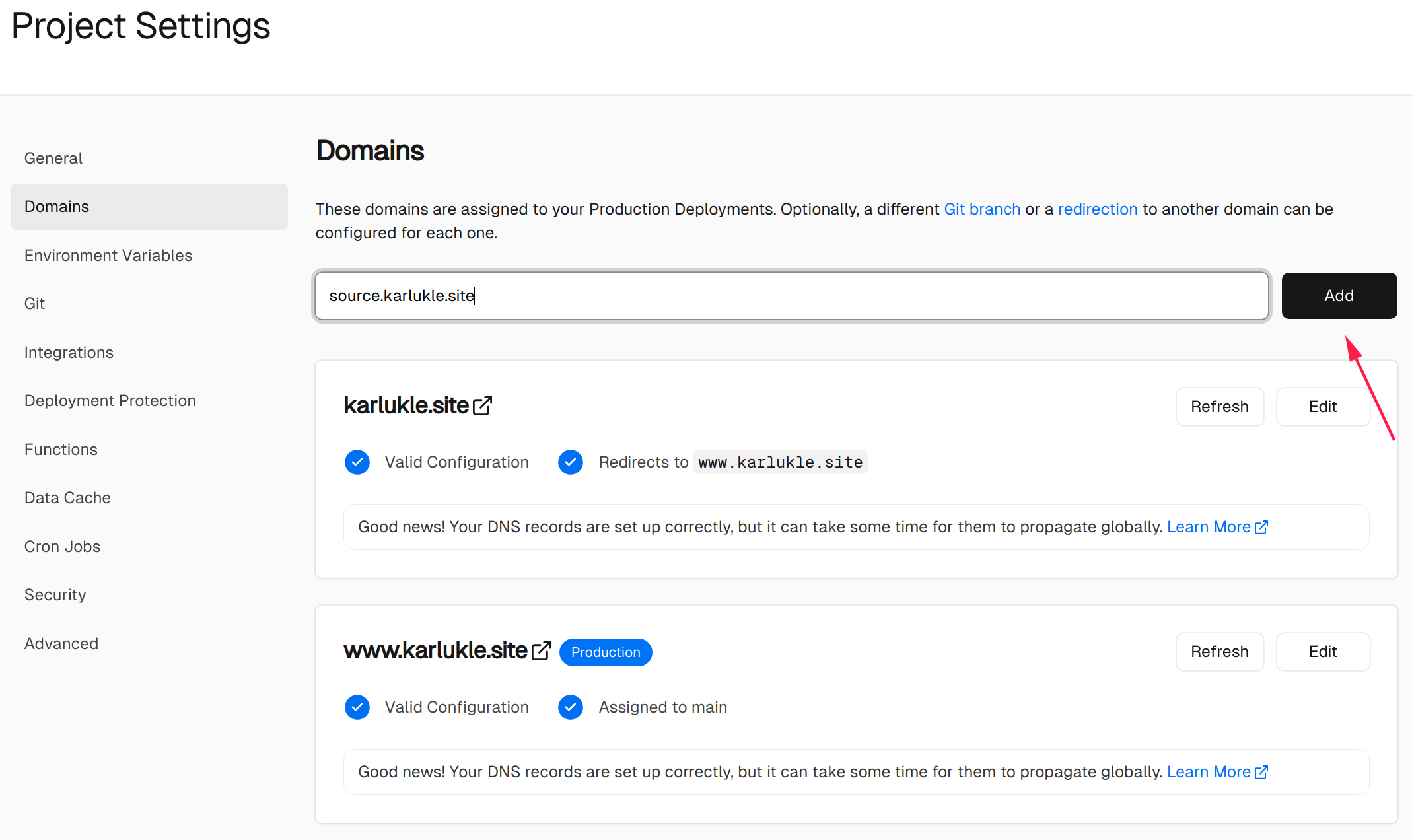然后来到 Vercel 给要使用CDN的网站添加一个自定义的二级域名(如 <自定义>.<你的域名>.<你的后缀> )