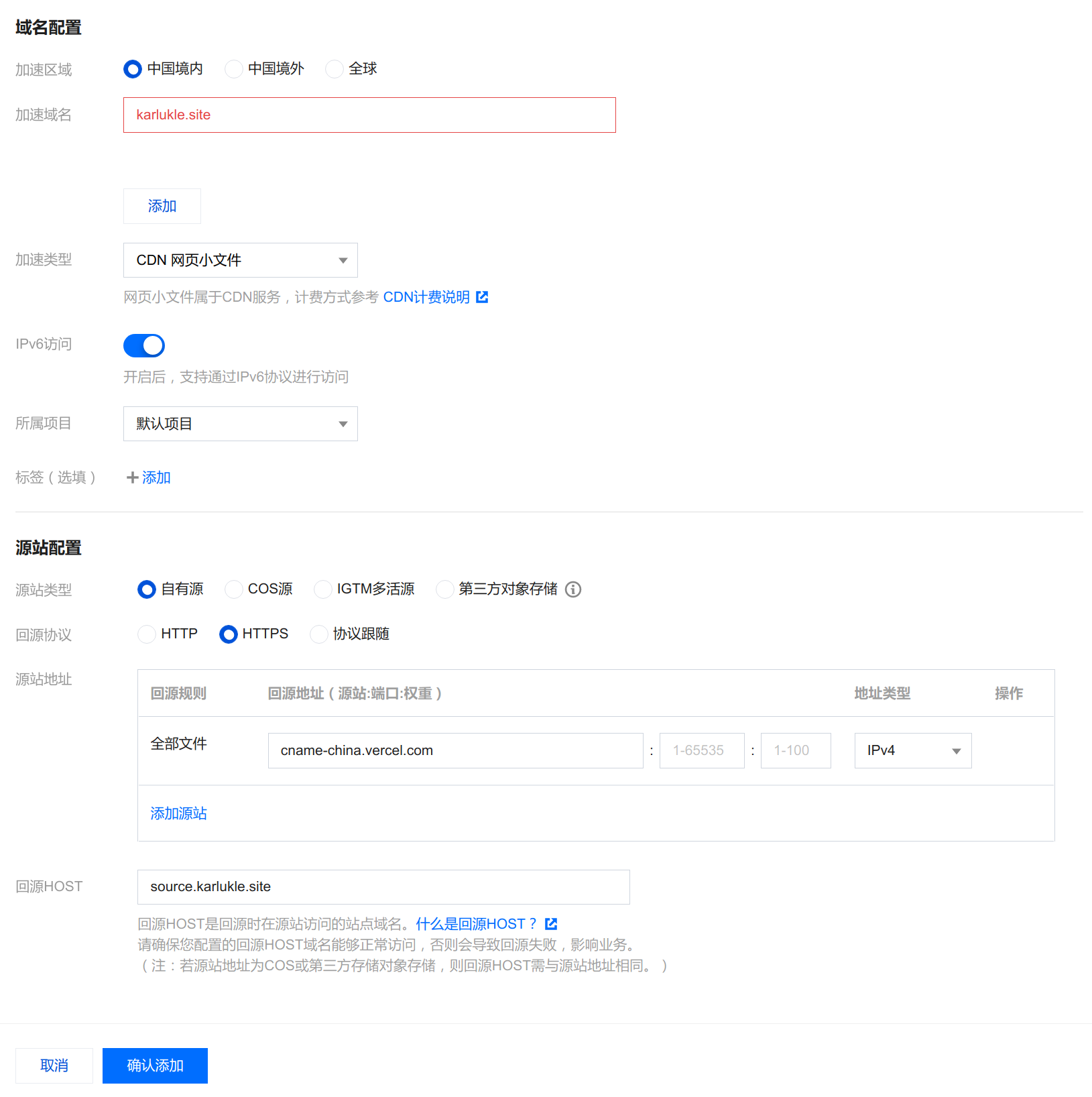 以腾讯云加速 Vercel 为例(既然已经购买了域名,选择 Vercel 提供的服务自然更好些)。